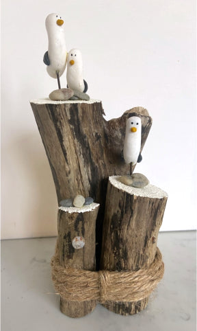 Driftwood, Fimo clay seagulls, twine.