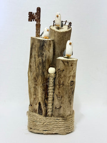 Driftwood, Fimo clay seagulls, twine, rusty key, nails and wire.