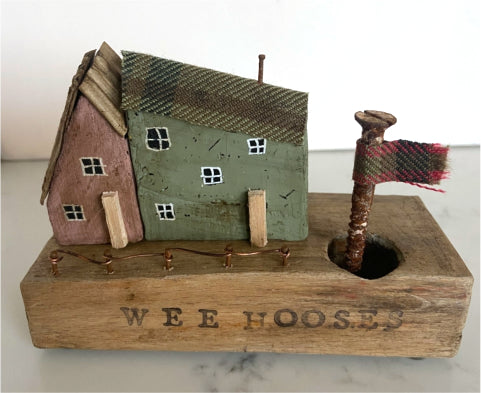 Emma's artworks are created using found items, salvaged treasures and many include pieces of whisky barrel lids and driftwood.