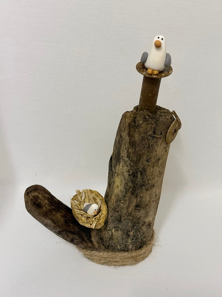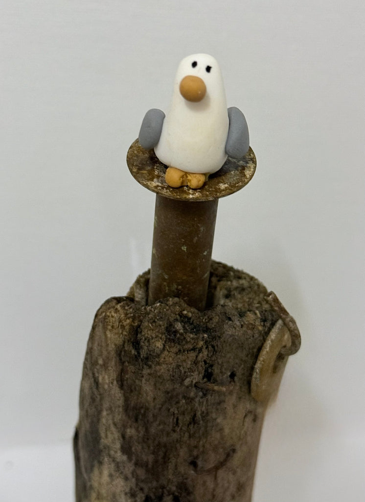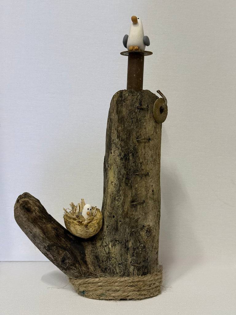 Driftwood, Fimo clay seagulls, twine, nutshell, rusty nails, pipe and washer.