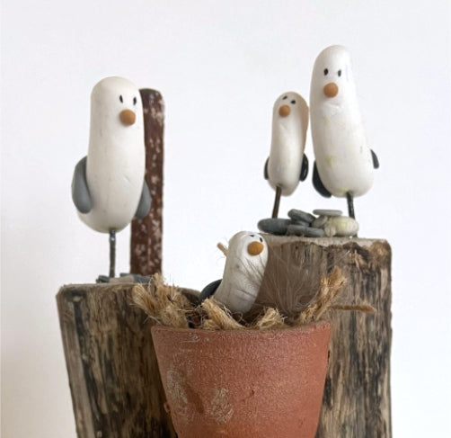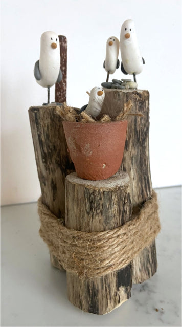 Driftwood, Fimo clay seagulls, twine, clay pot, feathers.