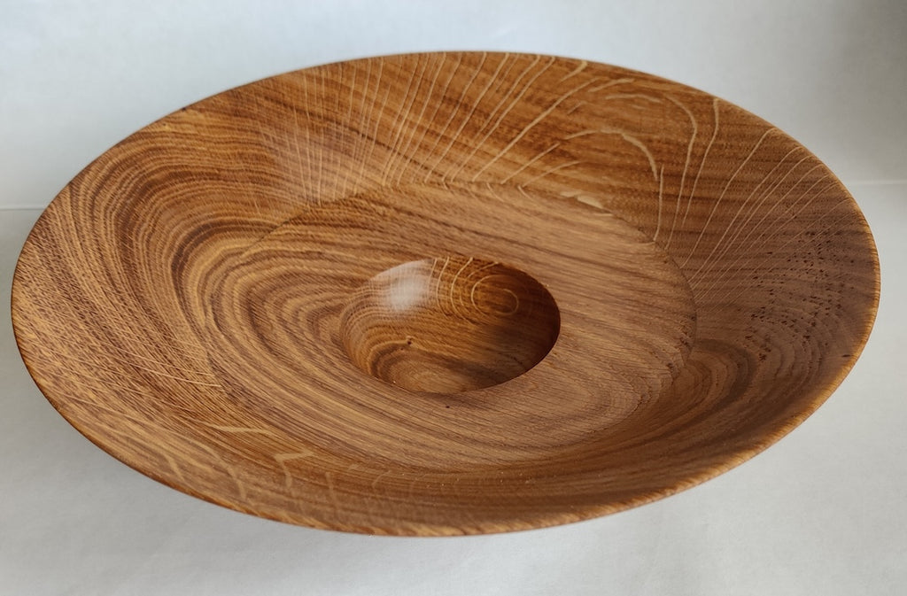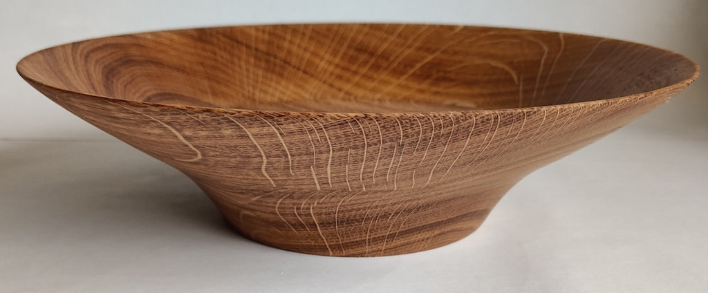 Oak bowl made from a n Oak board. Making a bowl from a board reduces the wast material produced.